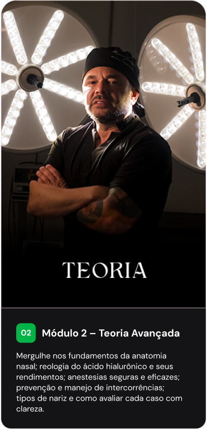 Sua abordagem global da face une ciência, técnica e arte. Neste curso, ele entrega o que há de mais refinado, testado e confiável na rinomodelação estética atual.